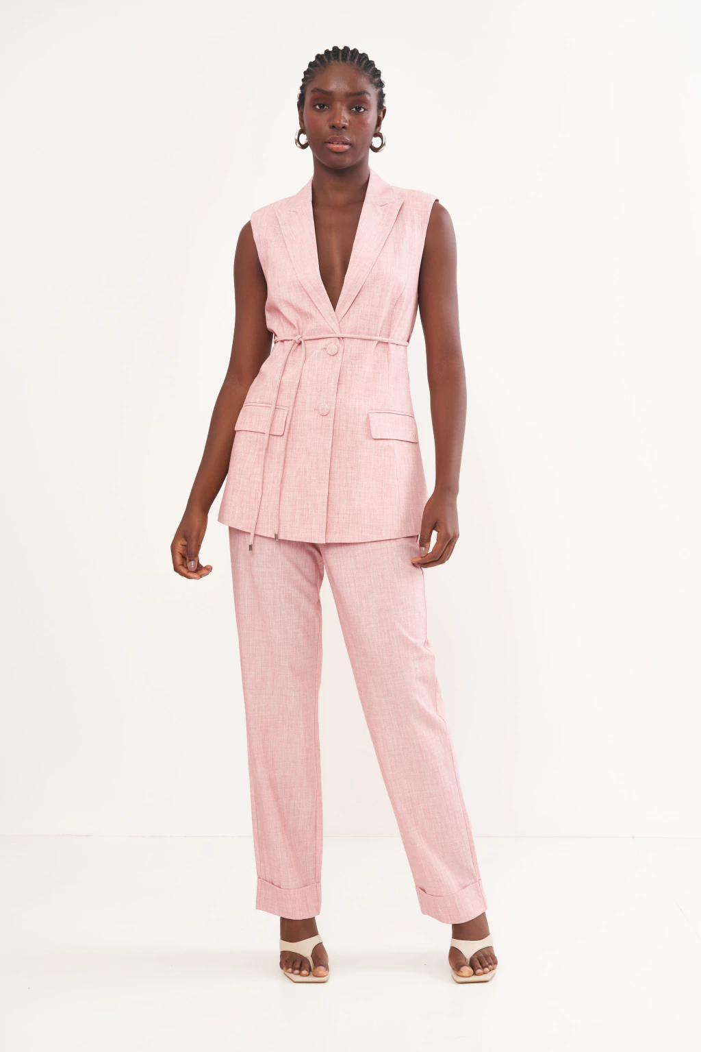A alfaiataria é reimaginada para a primavera com uma dose de leveza e romance. Este blazer sem mangas, em um sofisticado tom de rosa pastel, é a peça que define a elegância moderna da coleção Riviera. Sua silhueta alongada e a amarração que define a cintura criam um visual que é ao mesmo tempo poderoso e delicado, refletindo a essência da mulher que transita com autenticidade entre a força e a suavidade.