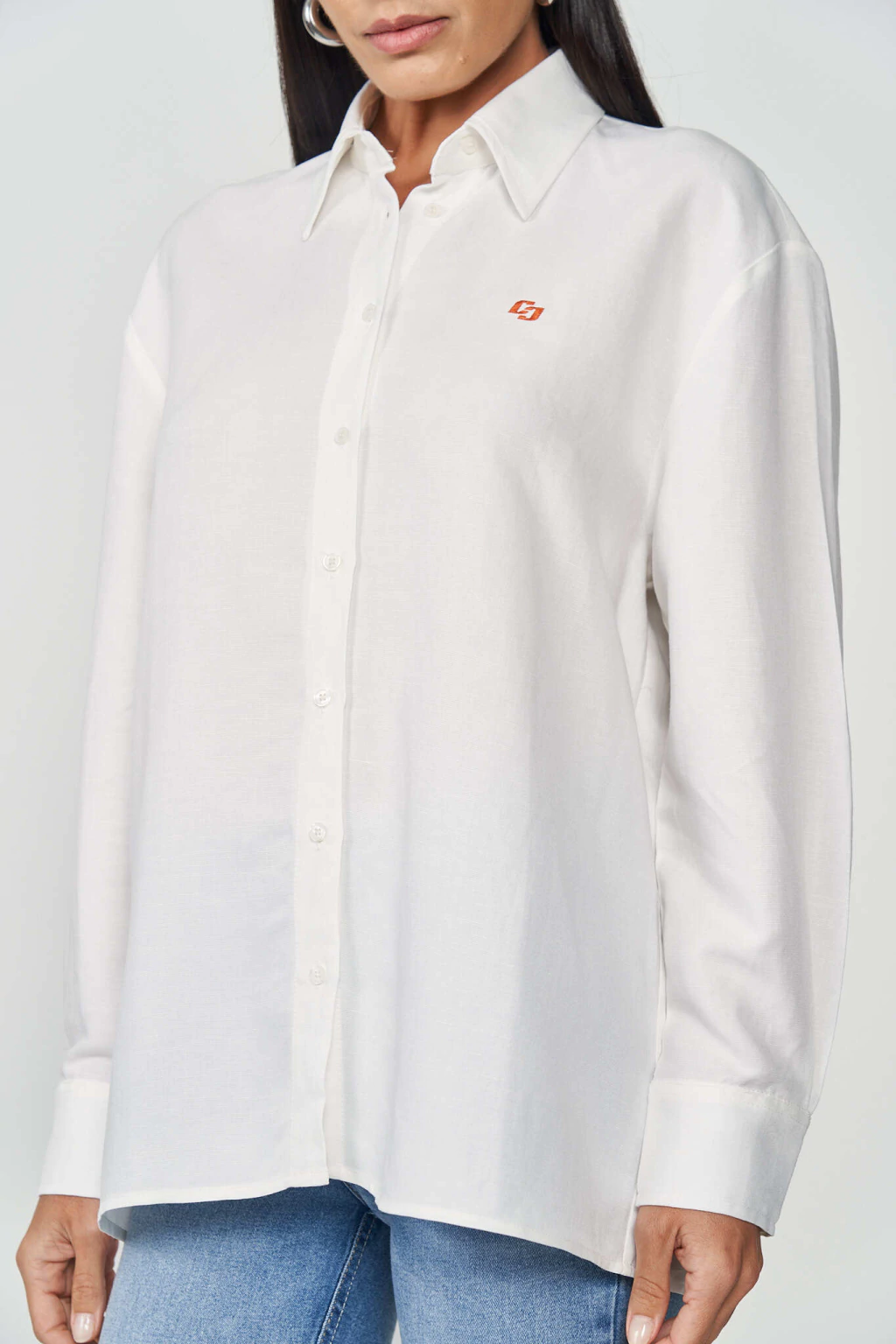 Camisa: Modelagem solta e confortável, manga longa com abotoamento nos punhos, gola clássica, detalhe do bordado na parte frontal.