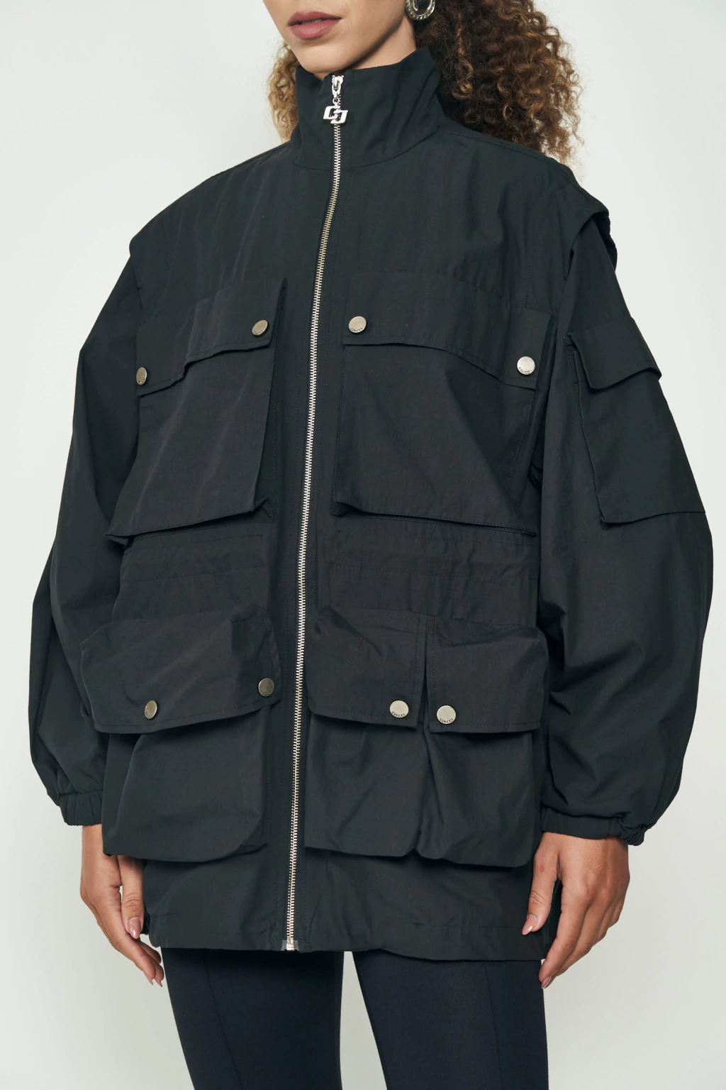 Design: Jaqueta utilitária, mangas longas, gola alta, zíper frontal, vários bolsos, cordão na cintura