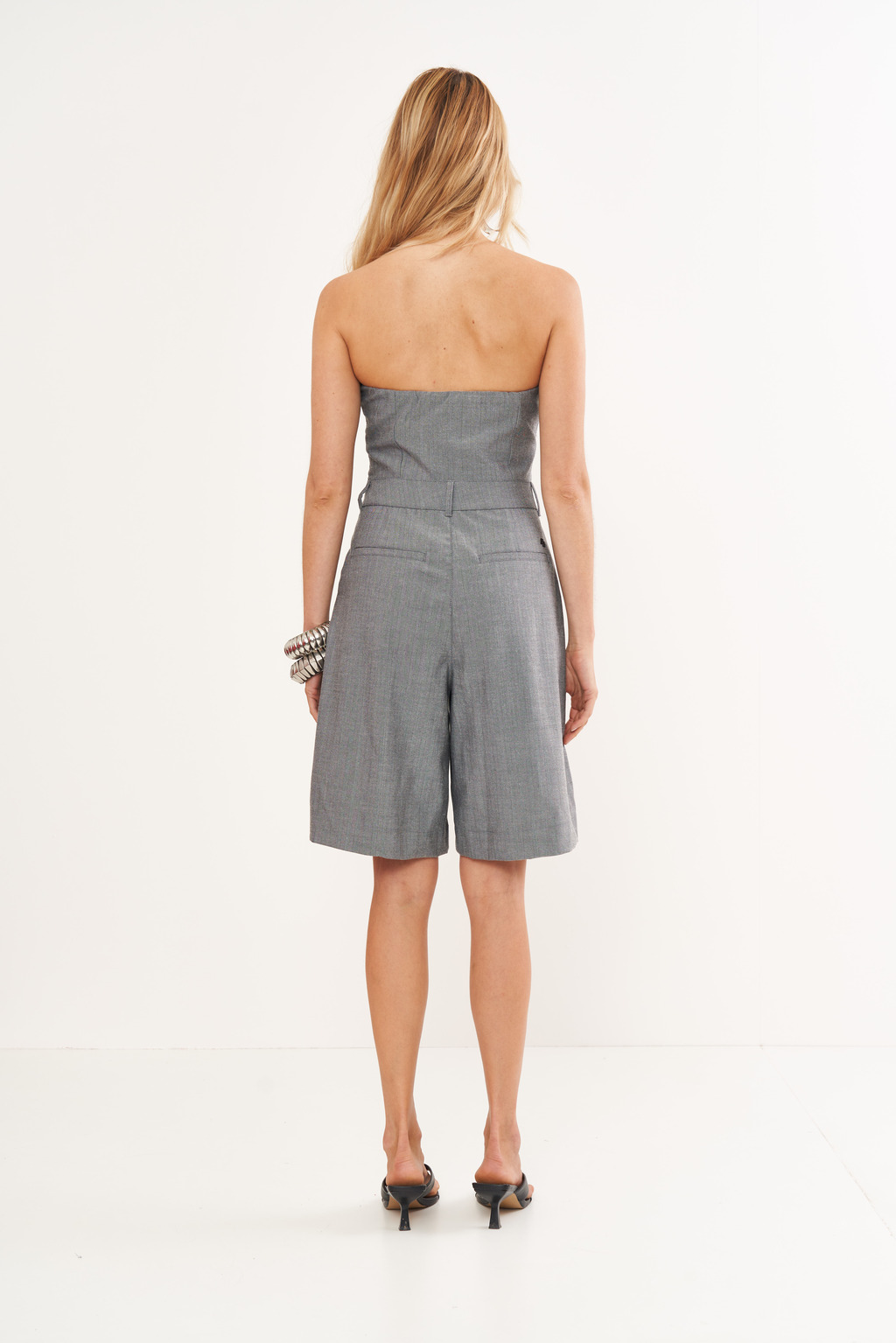 Design: Peça única (macaquinho) com top tomara que caia (strapless) estruturado e parte inferior no estilo bermuda de alfaiataria, com pernas amplas e comprimento na altura dos joelhos.